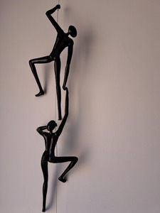 Deze figuurtjes worden gebogen en gevormd met Epoxy. Daarna komen er meerdere afwerklagen over. Ze worden gemaakt als solo, duo en trio. De geveltoeristen hangen aan een staaldraad tegen de muur.
